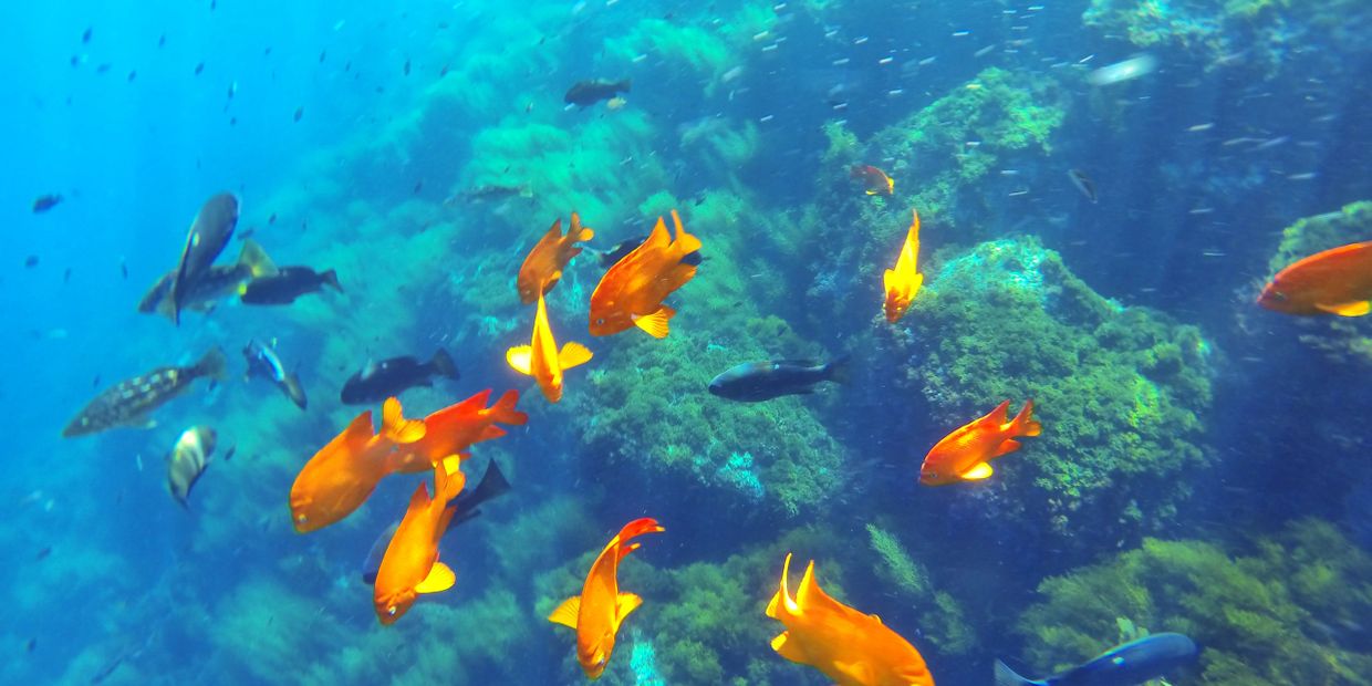 Estos hermosos peces naranjas decoran las aguas poco profundas aquí y son una marca registrada de Avalon. Están fuera de los